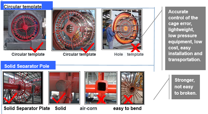 3. খাঁচা ব্যাস ত্রুটি নিয়ন্ত্রণ নির্ভুলতা, লাইন rebar স্পেসিং ত্রুটি ছোট, 1cm মধ্যে নিয়ন্ত্রিত করা যাবে; এক মিটার coils বিরতি ত্রুটি 5 মিমি মধ্যে নিয়ন্ত্রণ করা যেতে পারে।